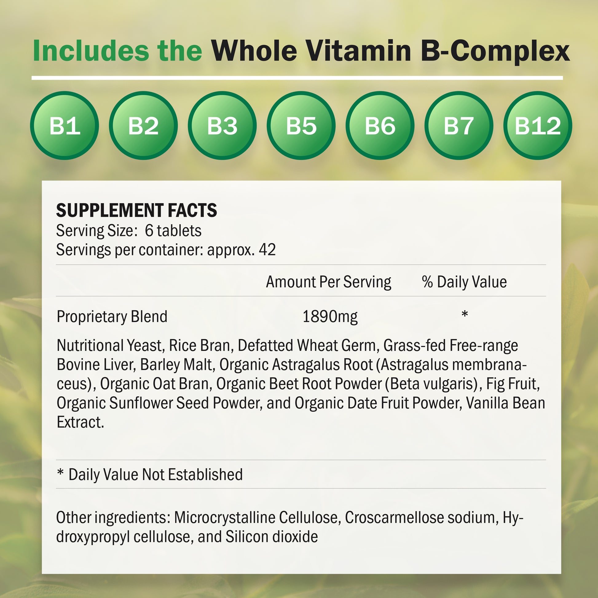 Nutritional Yeast, Brown Rice Bran*, Defatted Wheat Germ, Sprouted Barley Malt*, Astragalus Root*, Oat Bran*, Beet Root*, Bovine Liver†, Wildcrafted Fig Fruit, Sunflower Seed*, Vanilla Bean* and Untreated Date Fruit.