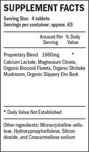 Proprietary Blend of Calcium Lactate (260mg), Magnesium Citrate, Broccoli Florets* and Leaf*, Slippery Elm Bark*.