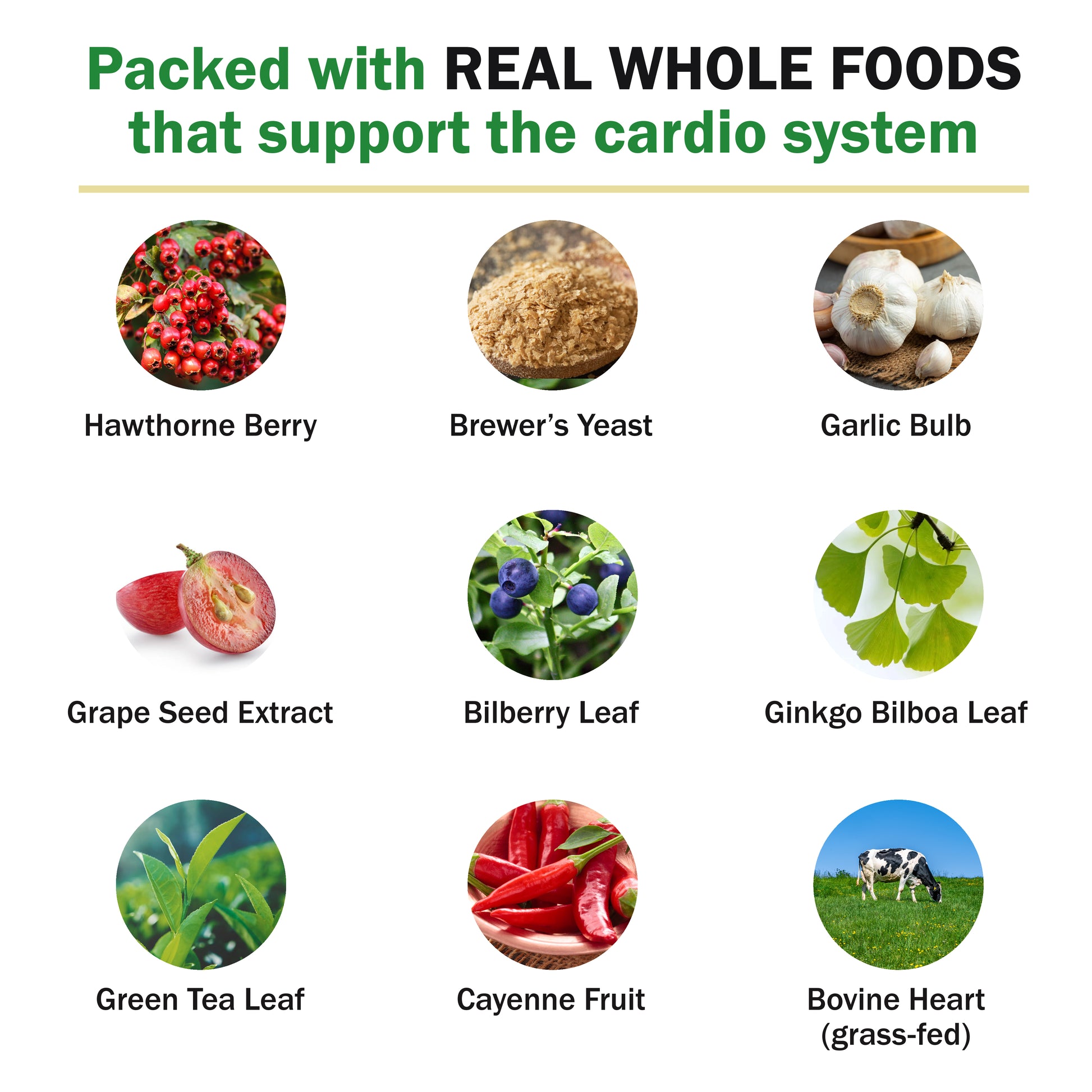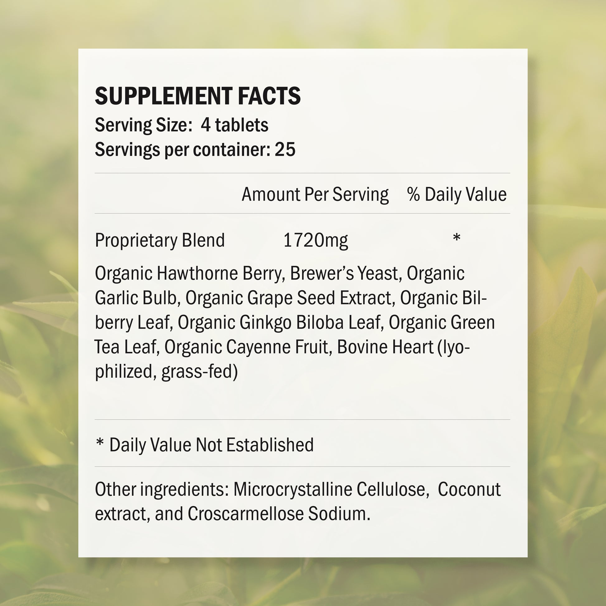 Hawthorne Berry,* Brewer’s Yeast, Garlic Bulb,* Grape Seed Extract,* Bilberry Leaf,* Ginkgo Biloba Leaf,* Green Tea Leaf *, Cayenne Fruit*, and Bovine Heart†