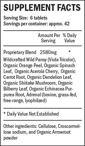 Wild Pansy Herb, Spinach*, Orange Peel*, Carrot Root*, Acerola Berry*, Dandelion Leaf*, Shiitake Mushroom Fruiting Body 4:1 Extract*, Bilberry Fruit*, Green Tea.